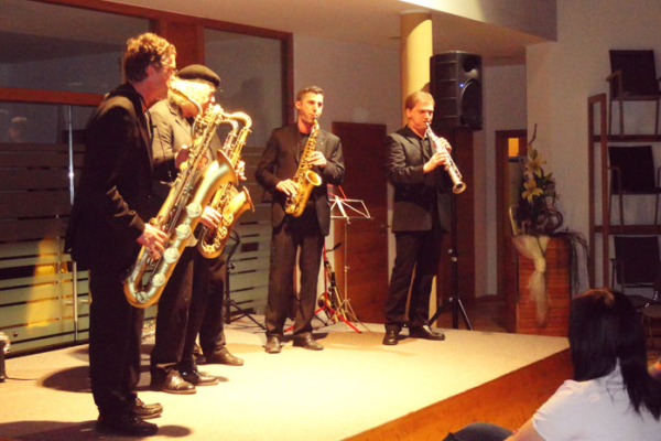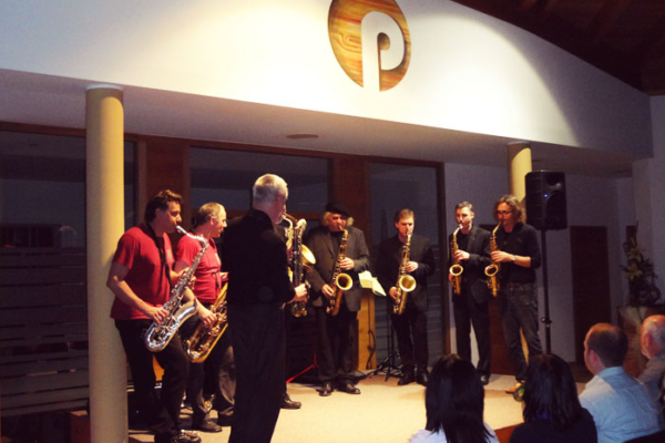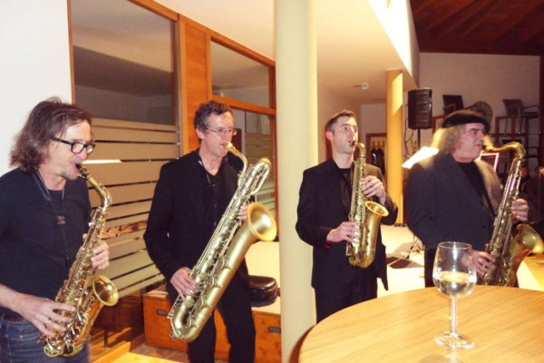 Die Gruppe „SaxFrontal“ und die Meister dieser Klasse „SAXOFOUR“ sorgten diesmal bei „Musik im Pavillon“ für einen schwungvollen Abend bei der Firma Pointner Rundholz.